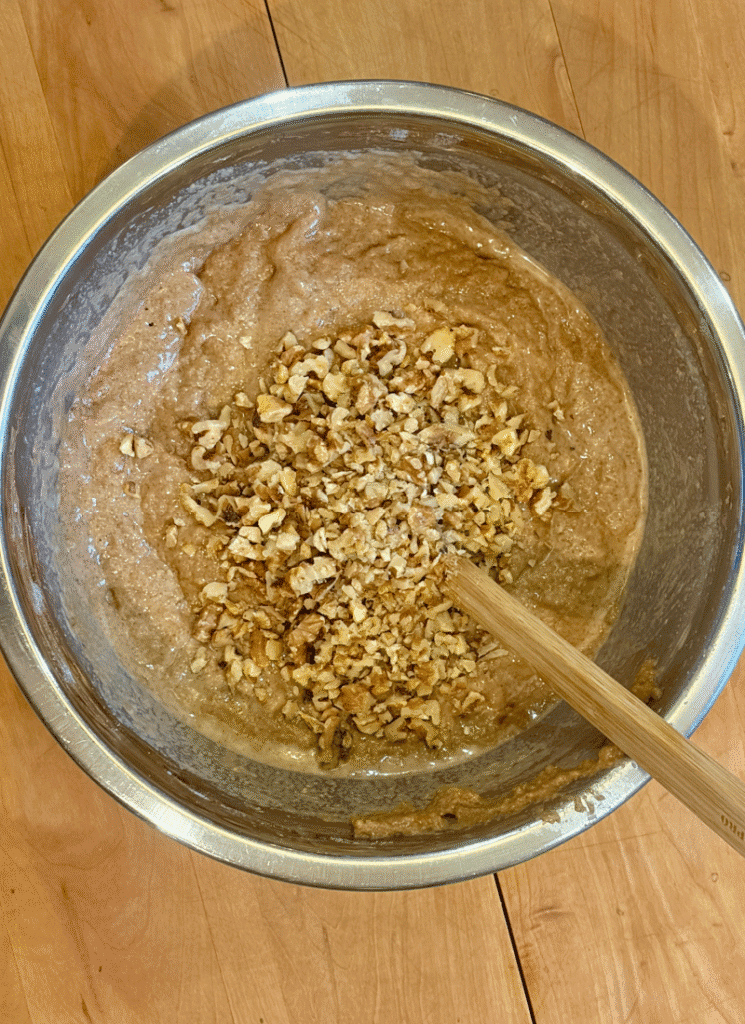 Next, you’ll make a well in the flour bowl and add the wet ingredients and the sugars, along with the chopped walnuts if desired.