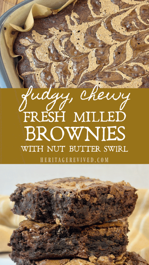 That’s why I decided to include a nut butter swirl in this fresh milled brownie recipe. It just adds another layer of contrasting flavor and creates a beautiful dessert to look at!
