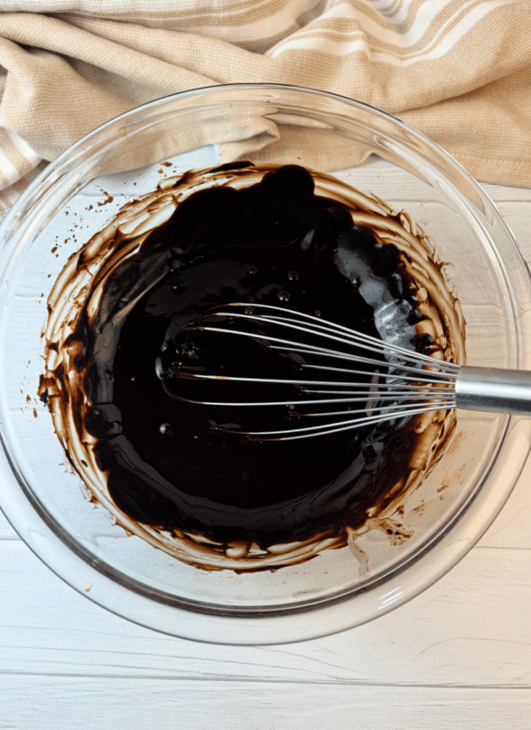 You’ll start by melting the butter (1-1/2 sticks or 3/4 cup) in a large glass bowl in the microwave. Immediately after, add the cocoa powder and olive oil and whisk well.